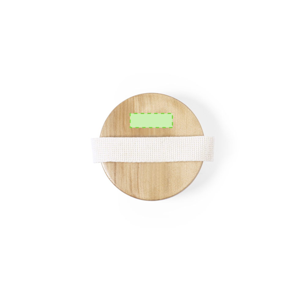 Peeling-Massagebürste aus Naturholz, mit passendem Befestigungsband. Präsentiert in einem Beutel aus natürlicher Baumwolle mit Kordelzugverschluss.