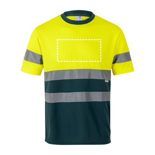 Two-tone bird-eye technical T-shirt (140g/m²), in polyester (100%). Kurze Ärmel, mit geripptem Rundhalsausschnitt in Kontrastfarbe. Reflektierende Streifen auf dem Rumpf und den Ärmeln. Produkt gemäß EU-Verordnung 2016/425, zertifiziert nach EN20471 und Klasse Nº 1. Größe: 4XL,5XL