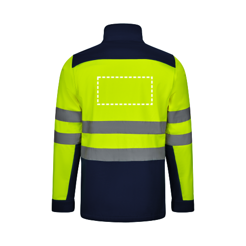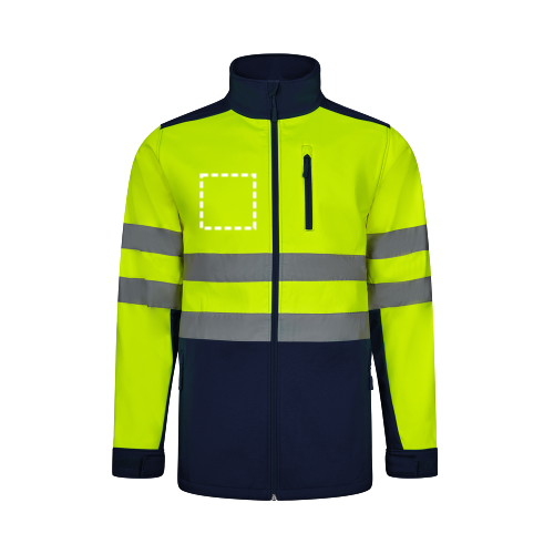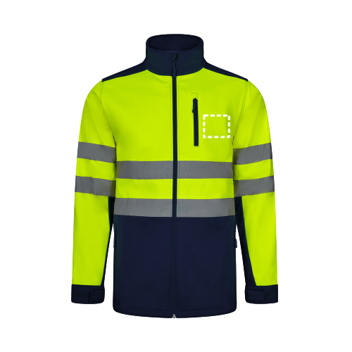 Zweifarbige Softshell-Jacke (280 g/m²), mit Fleece-Futter und TPU-Membran, aus Polyester (96 %) und Elastan (4 %). Dreilagiges Gewebe, mit umgekehrtem Zentralreißverschluss in Kontrastfarbe, oben umgeschlagene Innenleiste, verstellbare Bündchen mit Klettverschluss. Reflektierende Streifen auf der Brust und den Ärmeln. Enthält fünf Taschen: 3 Taschen mit Reißverschlüssen und 2 aufgesetzte Innentaschen. Produkt gemäß EU-Verordnung 2016/425, zertifiziert nach EN20471 und Klasse Nº 2. Größe: 4XL,5XL